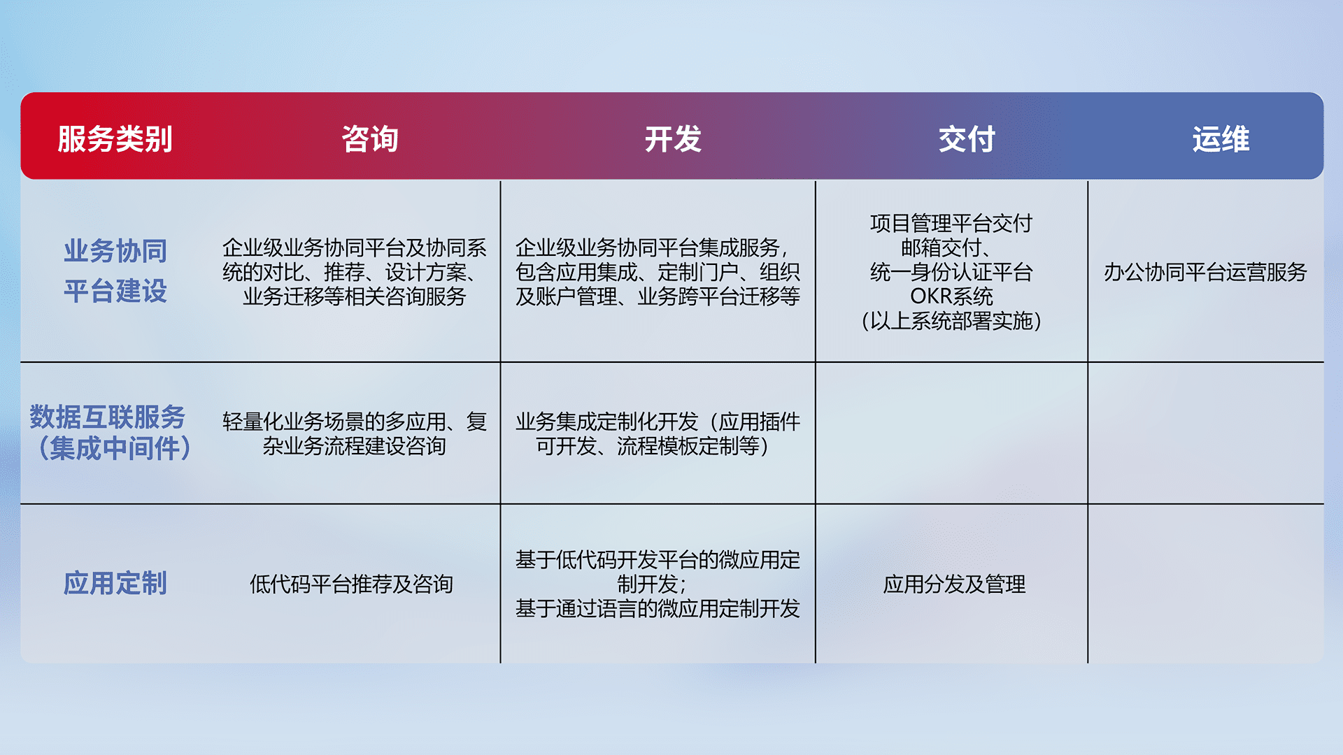 针对钉钉、、企微、、、、IDaas等平台级产品提供产品的规划、、方案、、交付、、、定制化开发等服务,,,实现如统一协同办公、、、智能客户服务、、、、混合会议管理、、、智能数据查询、、等业务场景,,,,实现数字化转型。。。。