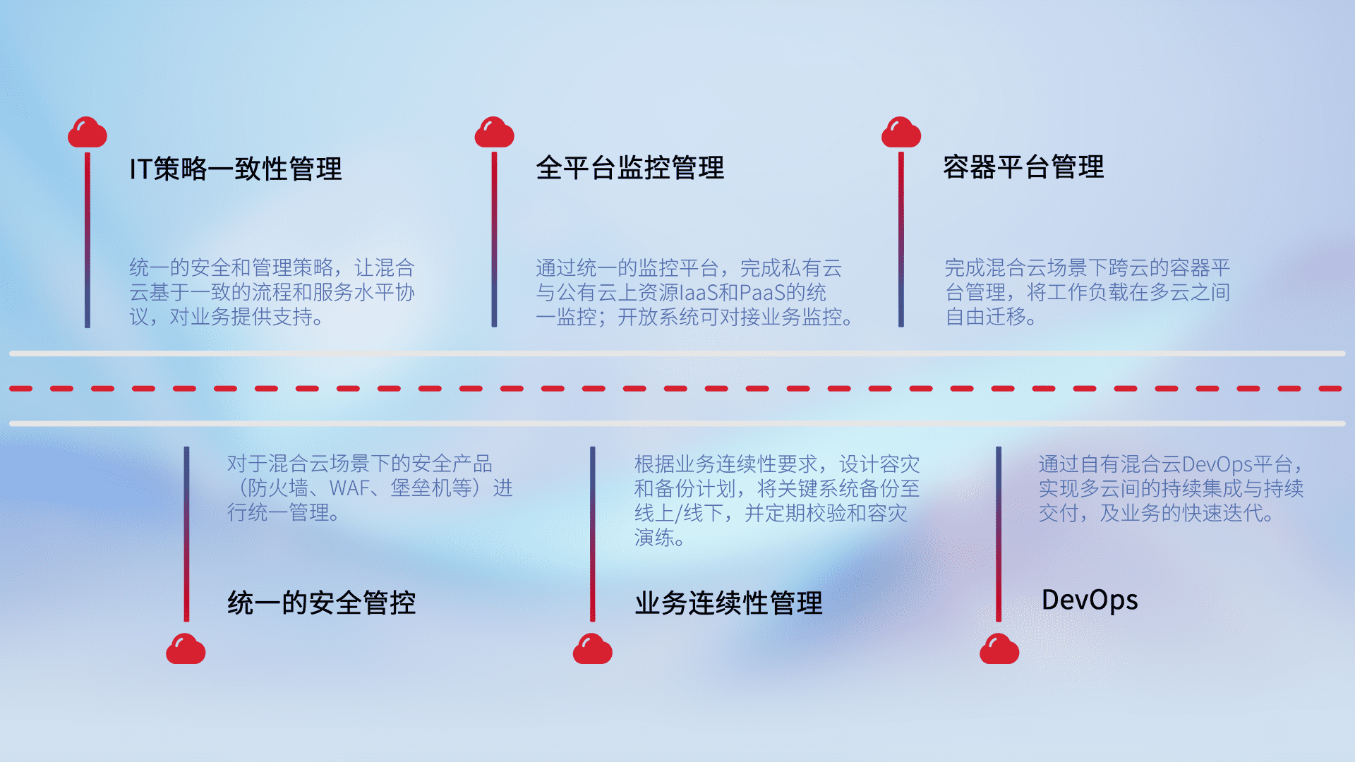 通过多云纳管,,,,以统一的资源数据模型把客户的云资源进行抽象和封装,,进而实现对多云资源的统一操作,,,保障云资源管理的可靠性、、、稳定性与可用性。。量身定制化运维内容,,,,配置、、开发运维、、补丁管理、、、、备份、、、、监控、、、认证和访问管理、、、审计和日常巡检等,,,保障在用云过程中的可靠度,,稳定度以及高可用率。。。。